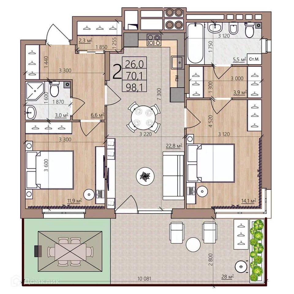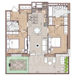 2 комн. квартира в ЖК Окская стрелка, площадь 98.1 м², жилая 26 м², кухня 22.8 м²