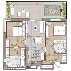 2 комн. квартира в ЖК Окская стрелка, площадь 96.4 м², жилая 25.2 м², кухня 22.6 м²