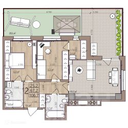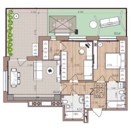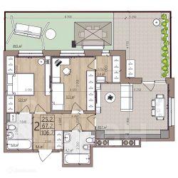 2 комн. квартира в ЖК Окская стрелка, площадь 106.7 м², жилая 25.2 м², кухня 20.7 м²