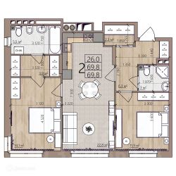 2 комн. квартира в ЖК Окская стрелка, площадь 69.8 м², жилая 26 м², кухня 22.8 м²