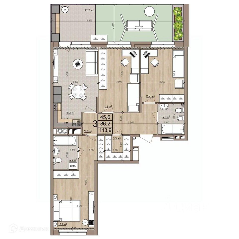 113,9 м²
