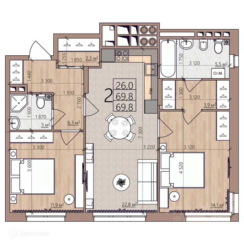 2 комн. квартира в ЖК Окская стрелка, площадь 69.8 м², жилая 26 м², кухня 22.8 м²