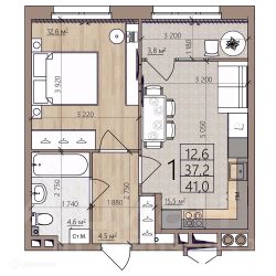 1 комн. квартира в ЖК Окская стрелка, площадь 41 м², жилая 12.6 м², кухня 15.5 м²