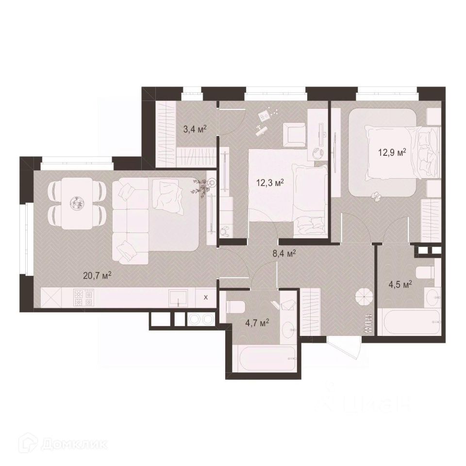 2 комн. квартира в ЖК Окская стрелка, площадь 66.9 м², жилая 25.2 м², кухня 20.7 м²