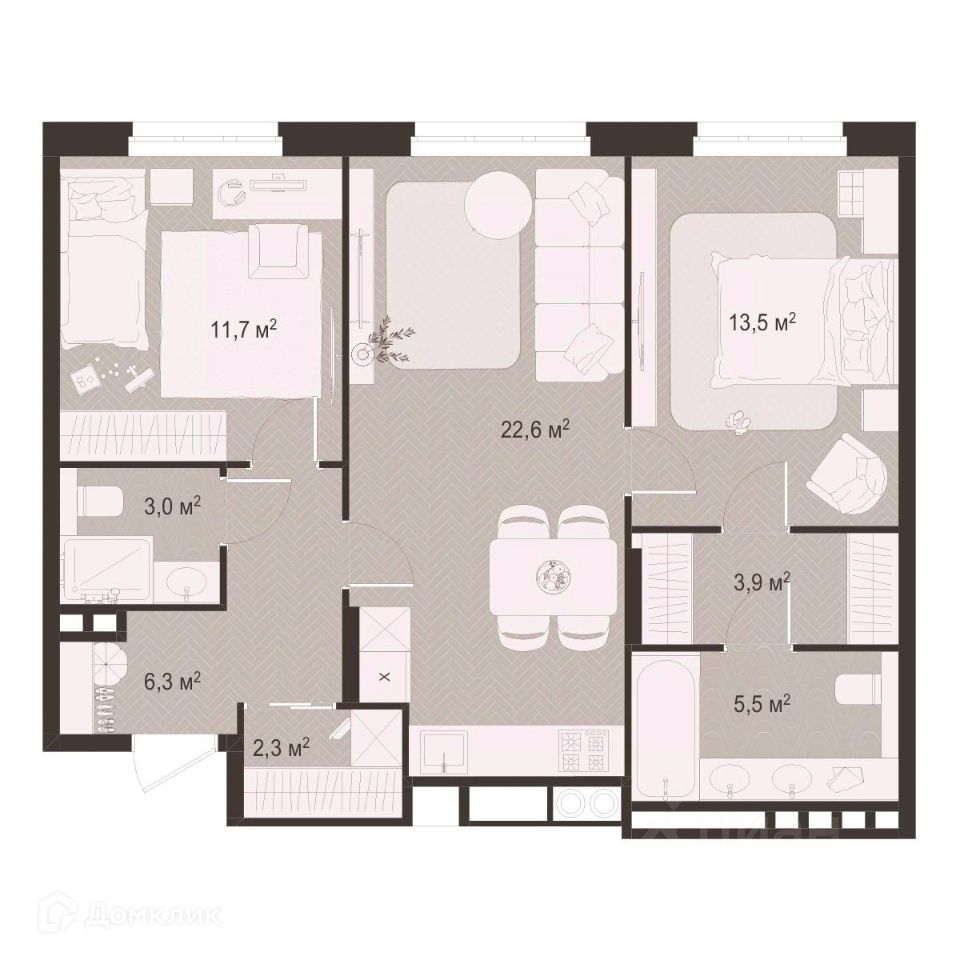 2 комн. квартира в ЖК Окская стрелка, площадь 68.8 м², жилая 25.2 м², кухня 22.6 м²