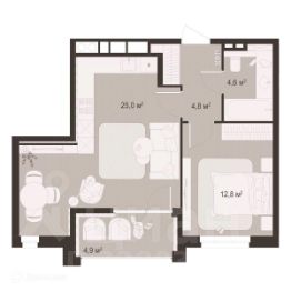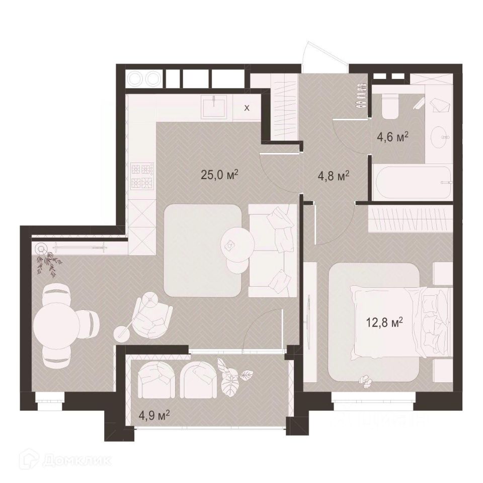 1 комн. квартира в ЖК Окская стрелка, площадь 52.1 м², жилая 12.8 м², кухня 25 м²