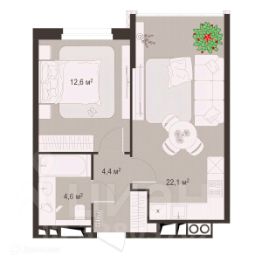 1 комн. квартира в ЖК Окская стрелка, площадь 43.7 м², жилая 12.6 м², кухня 22.1 м²