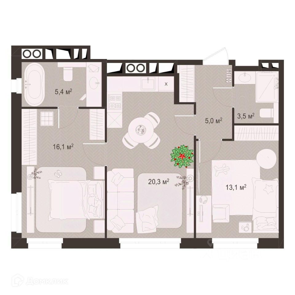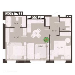 2 комн. квартира в ЖК Окская стрелка, площадь 63.2 м², жилая 29.2 м², кухня 20.3 м²