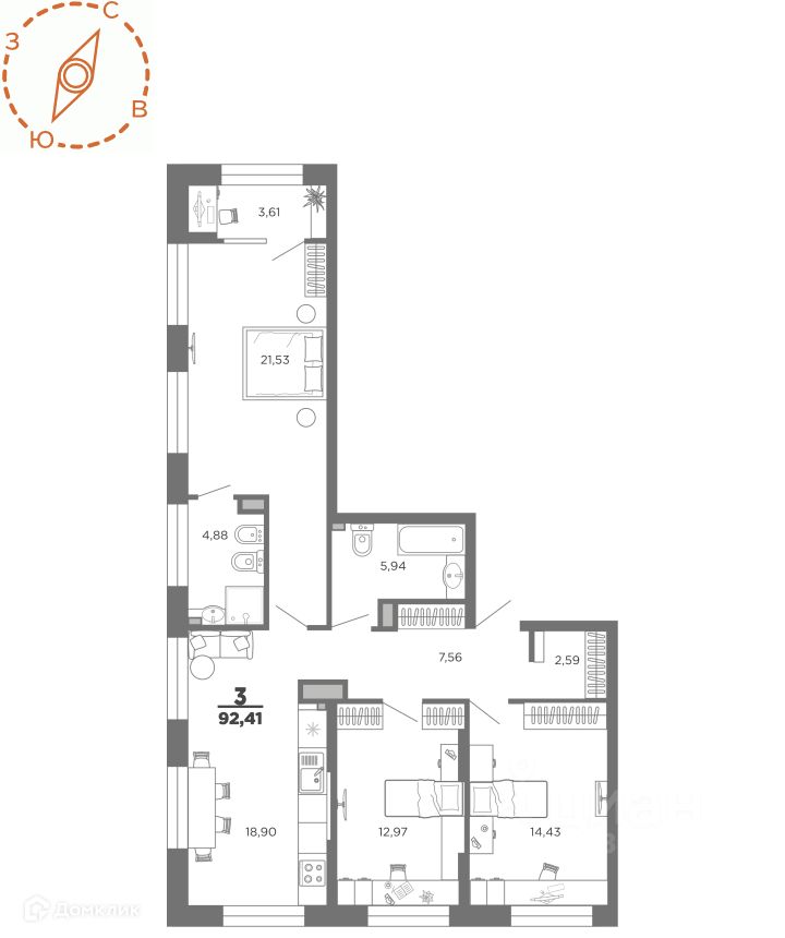 3 комн. квартира в ЖК Нобель, площадь 92.41 м², жилая 48.93 м², кухня 18.9 м²