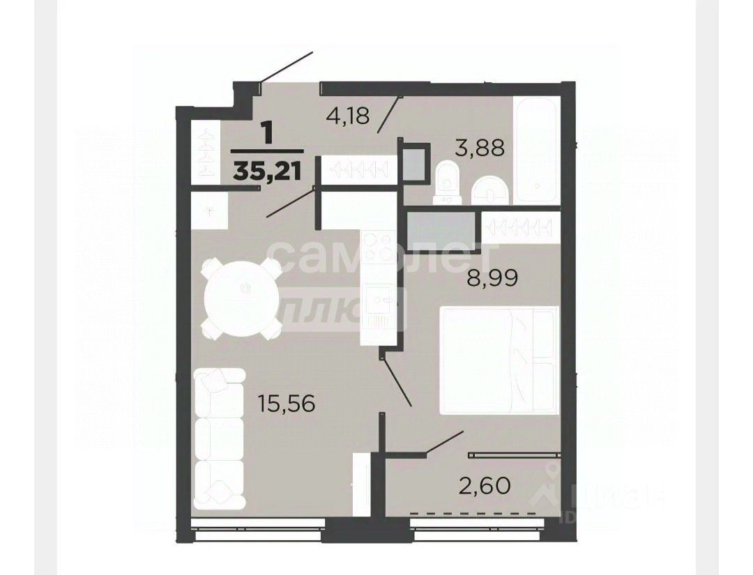 *Планировка: Функциональная кухня-гостиная (15.56 м²) и одна спальня (жилая площадь 9 м²). Это идеальное решение для одного человека или пары, кто ценит комфорт и грамотное распределение пространства. Большая кухня-гостиная позволит с комфортом принимать гостей и проводить время с близкими.