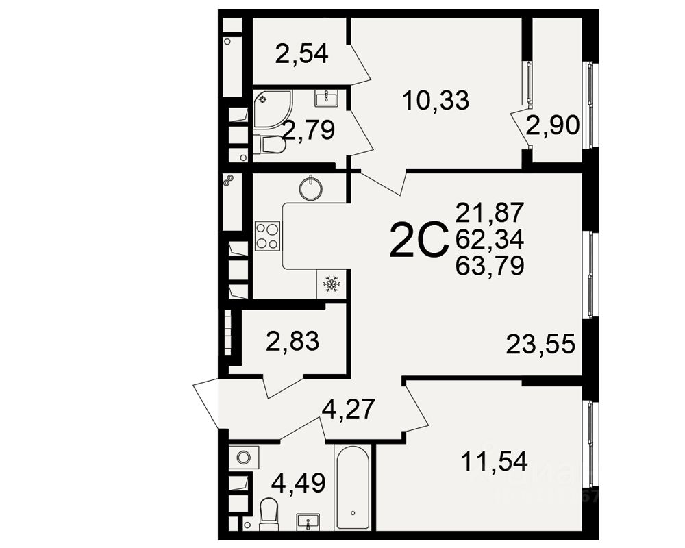 Продается 2-комн. квартира, 62,34 м²
