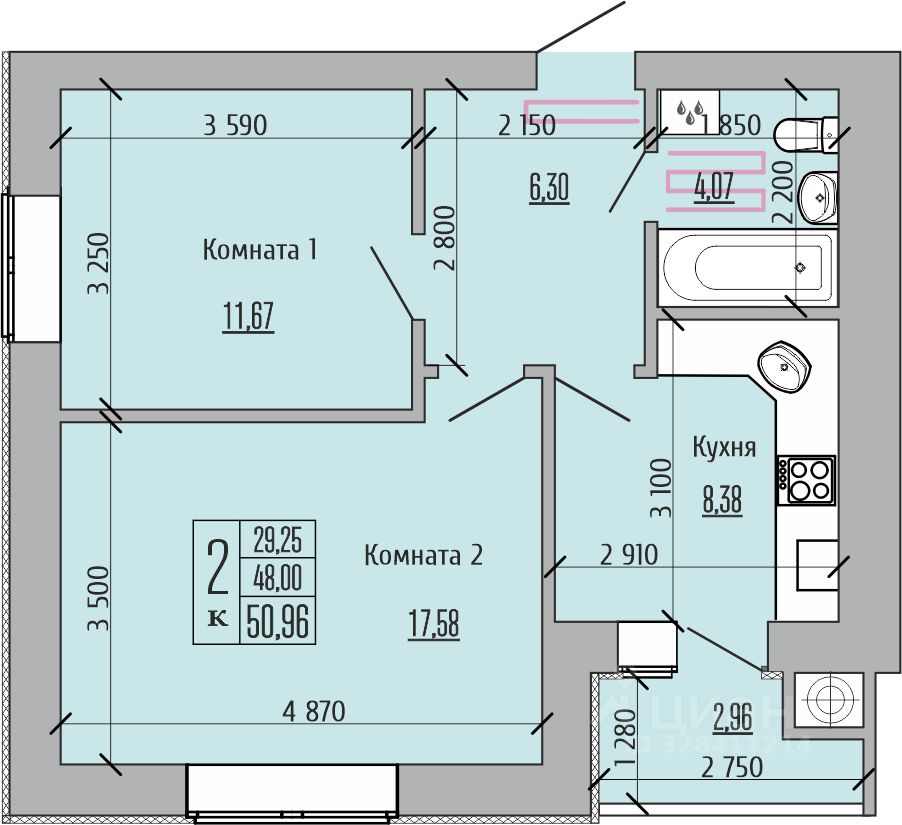 Классическая двухкомнатная квартира площадью 50,96 кв.м. Высокие потолки 2.7 метра! Отдельная кухня с удобной рабочей зоной. Большая мастер-спальня и детская комната.