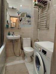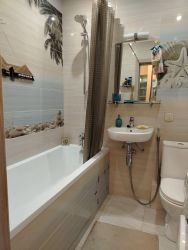 Санузел в плитке, ванна акрил, гигиенический душ, сантехника фирмы Roca.