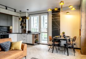 Здесь планировка с кухней-гостиной, отдельной спальней и гардеробной. Потолки выше, чем обычно, окна почти во всю стену — комната наполнена светом и не давит.