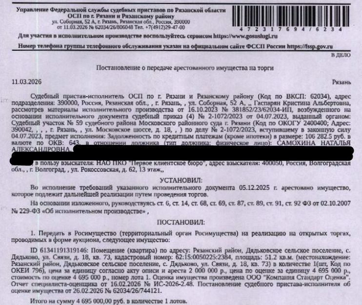 Помещение, назначение: жилое, площадь 51,2 кв.м., кадастровый номер 62:15:0050225:2384, адрес: Российская Федерация, Рязанская область, Рязанский район, Дядьковское сельское поселение, с. Дядьково, ул. Связи, д. 18, кв. 73. Сведениями о зарегистрированных по данному адресу лицах, а также о задолженности по взносам на капитальный ремонт Организатор торгов не располагает. Взыскатель: НАО ПКО "Первое Клиентское Бюро". Начальная цена: 4 695 000 (Четыре миллиона шестьсот девяносто пять тысяч) руб. 00 коп., без НДС. Задаток: 2 300 000 (Два миллиона триста тысяч) руб. 00 коп. Шаг аукциона 1%: 46 950 (Сорок шесть тысяч девятьсот пятьдесят) руб. 00 коп.