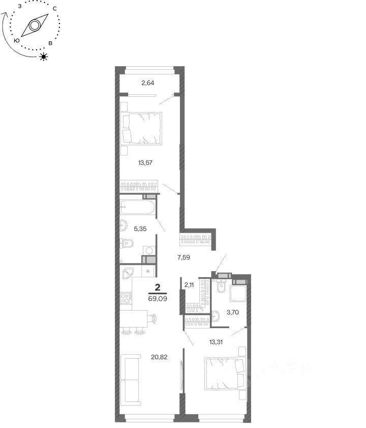 Общая площадь69,09 м²