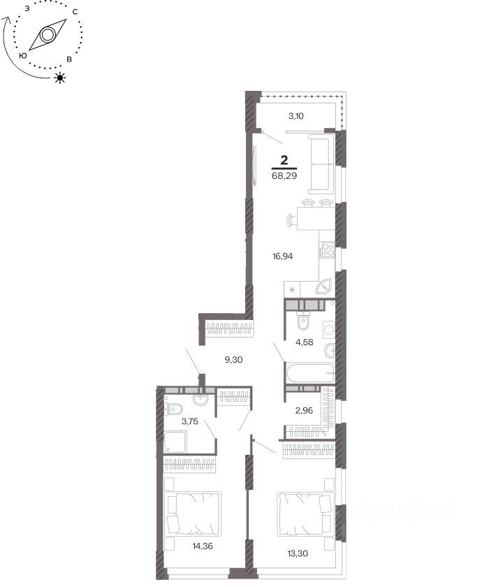 Общая площадь68,29 м²