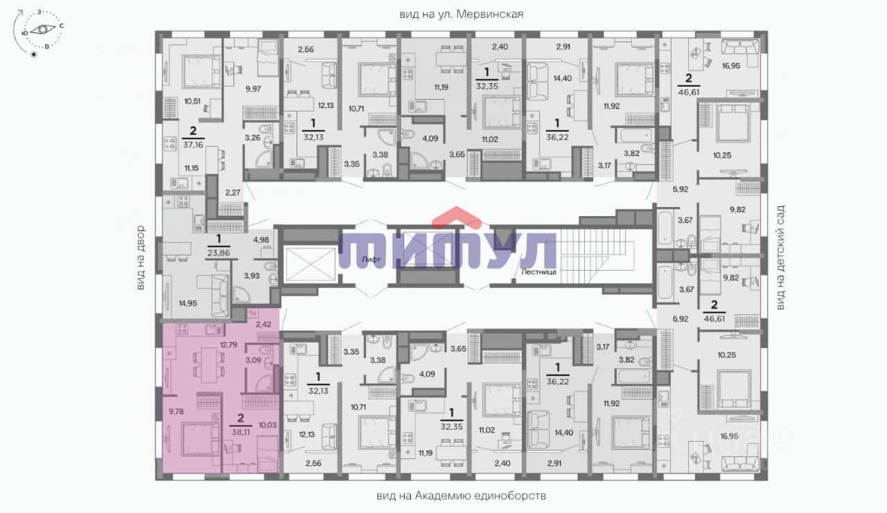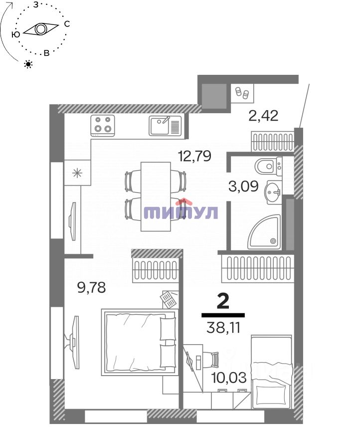 Светлая квартира с удобной планировкой: две изолированные комнаты с выходом на просторную кухню.