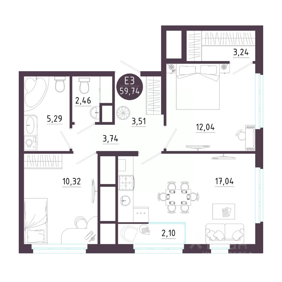Общая площадь59,74 м²