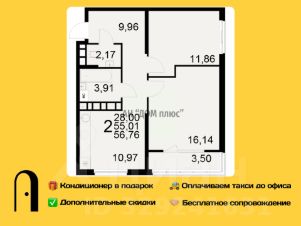 Двухкомнатная квартира 56.76 м² в ЖК "Радости жизни" от застройщика "Единство"
