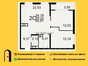Двухкомнатная квартира 60.97 м² в ЖК "Радости жизни" от застройщика "Единство"