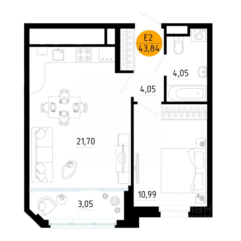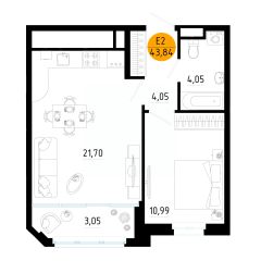 Здесь планировка с кухней-гостиной, отдельной спальней и гардеробной. Потолки выше, чем обычно, окна почти во всю стену — комната наполнена светом и не давит.