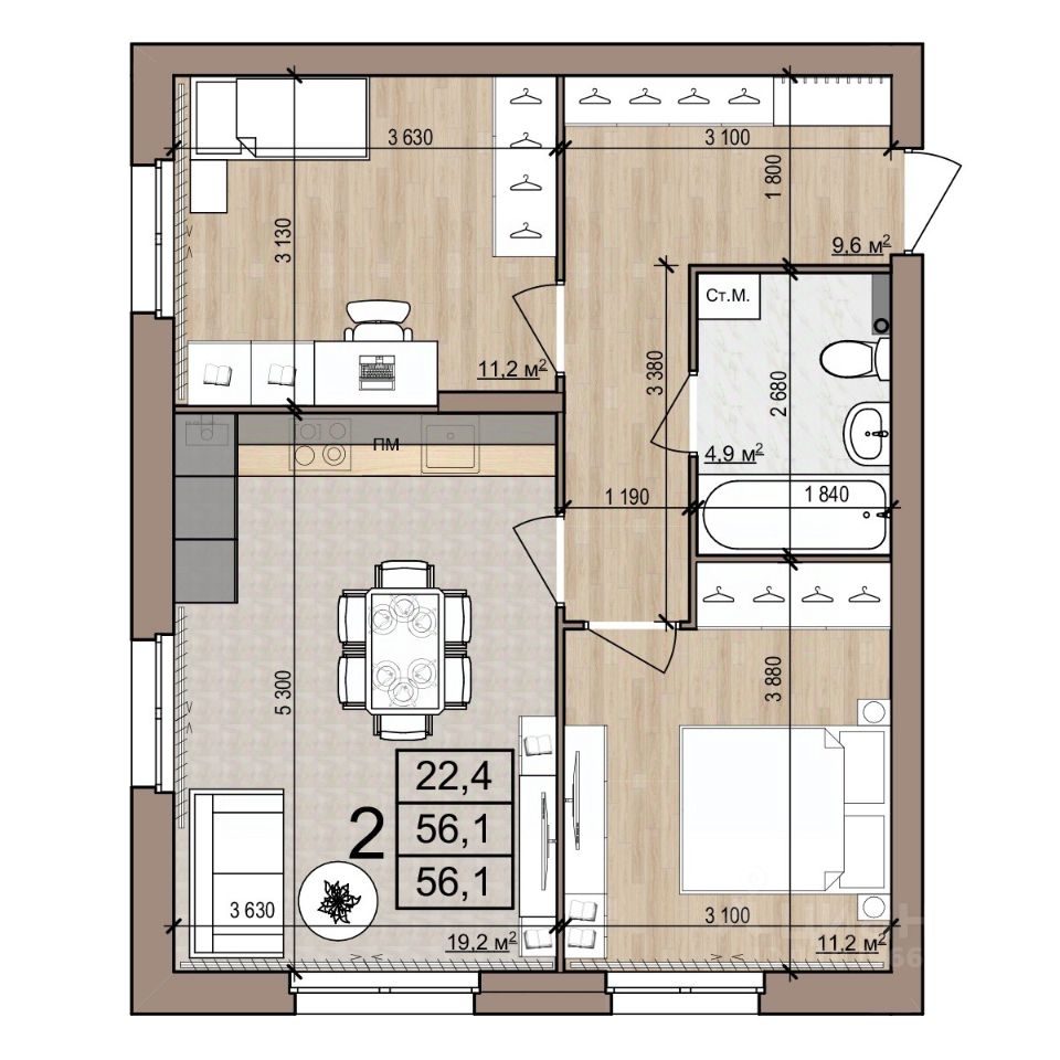 Квартира 192, 2-комнатная в ЖК Полярная звезда от компании "Зеленый сад". Московский район, развитая инфраструктура. Купить квартиру в новостройке в Рязани: 56.1 кв.м., 2 этаж. Кухня — 19.2 кв.м. Ипотека, Trade-In. Подробности на нашем сайте