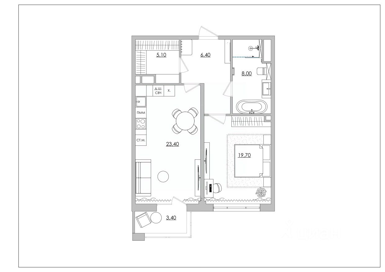 • Из гостиной предусмотрен выход на балкон. Это пространство расширяет границы квартиры: летом здесь можно обустроить зону отдыха с парой кресел и столиком, наслаждаясь видом за чашкой кофе.