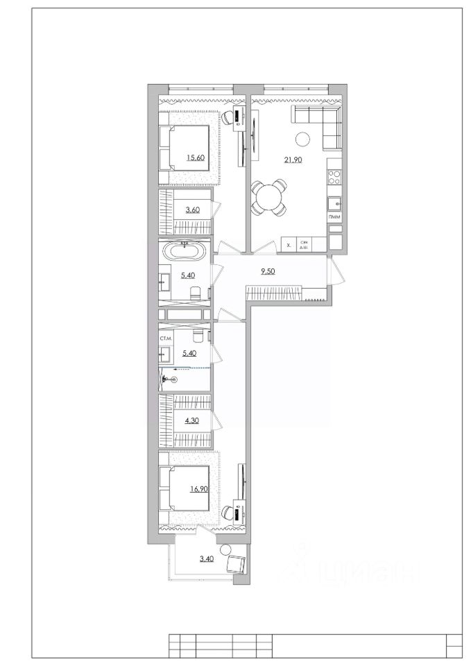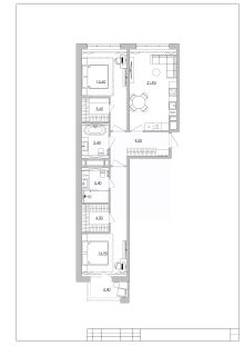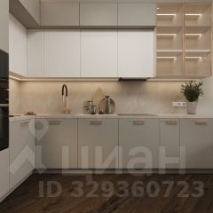 Далее коридор ведет вас в сердце квартиры угловую кухню-гостиную площадью 22 м2. Пространство легко зонируется на функциональную кухонную часть с современной встроенной техникой, обеденную зону и уютную гостиную с большим диваном для отдыха. Угловое расположение кухни позволяет эффективно использовать пространство, создавая комфортную рабочую поверхность и место для общения.