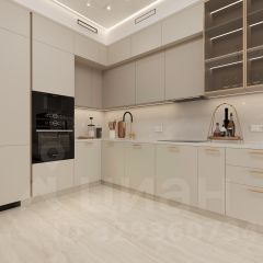 • Угловое расположение кухонного гарнитура позволяет максимально эффективно использовать пространство, создавая идеальный "рабочий треугольник" и оставляя много места для обеденной зоны.