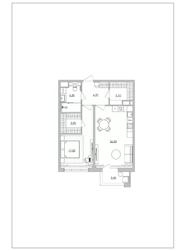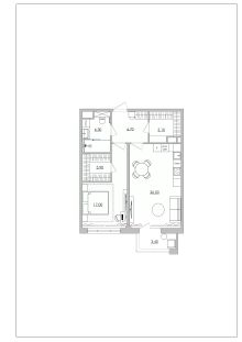 Это жилье формата "Master-Apartment", где утилитарные зоны вынесены за пределы жилых комнат, оставляя пространство чистым и свободным.