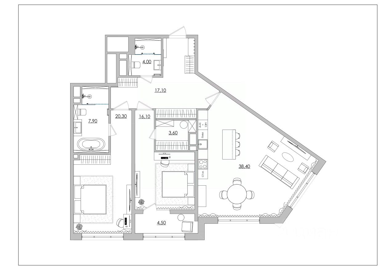 Площадь 111,9 м2 в такой планировке создают ощущение безграничного простора. Здесь нет тесных углов, только широкие проходы и масштабные комнаты.