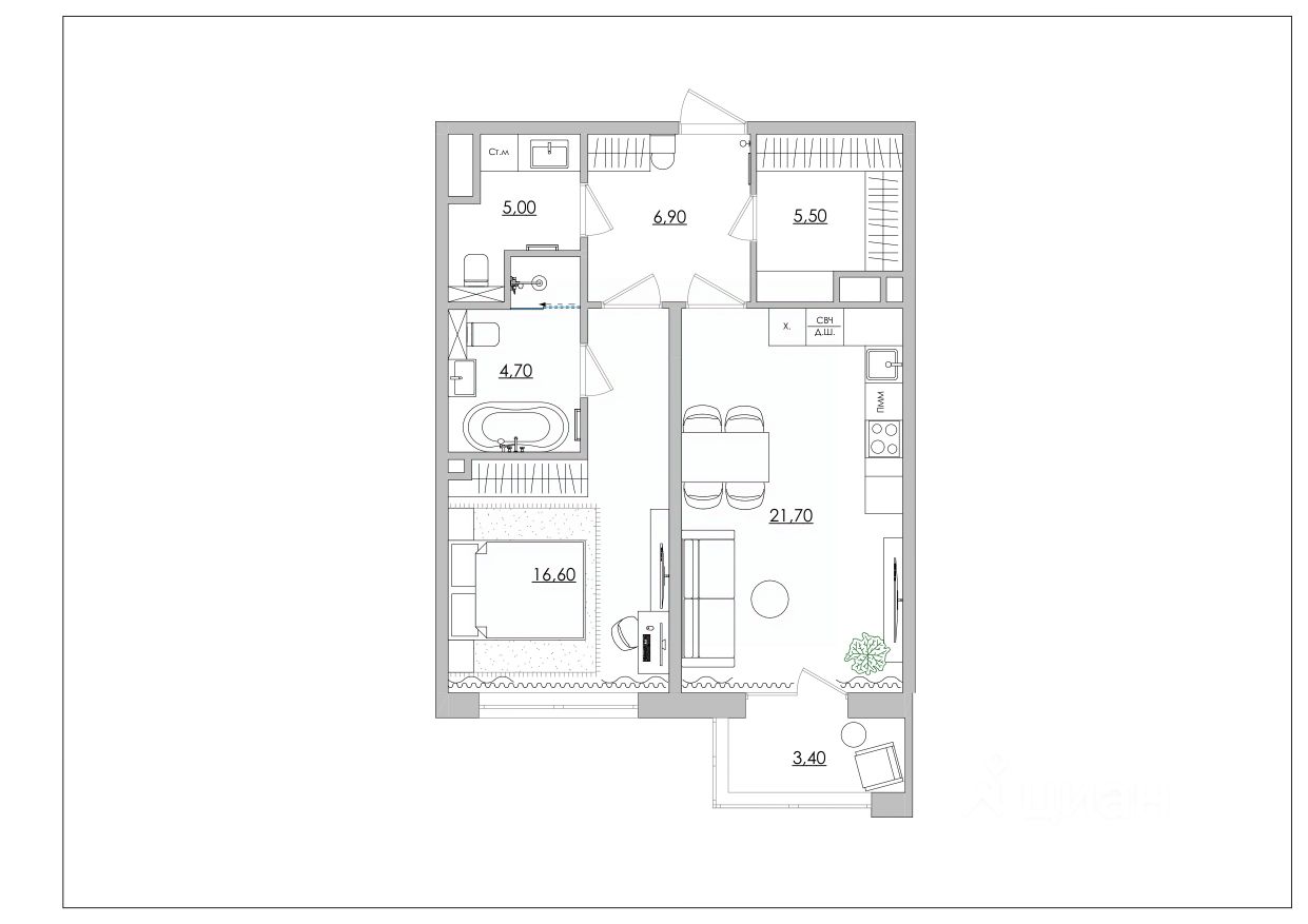 2. Зонирование "Публичное / Приватное": Квартира четко разделена. Гостиная и гостевой санузел находятся в одной части, а спальня с личной ванной — в другой. Вы можете принимать гостей, сохраняя свою спальню в полной неприкосновенности.