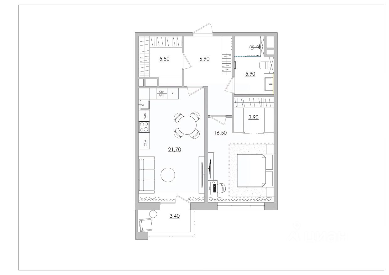 2. Зонирование "Публичное / Приватное": Квартира четко разделена. Гостиная и гостевой санузел находятся в одной части, а спальня с личной ванной — в другой. Вы можете принимать гостей, сохраняя свою спальню в полной неприкосновенности.