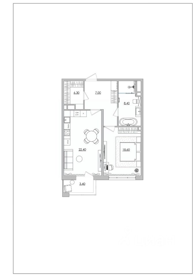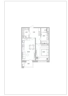 Главное пространство в этой квартире сосредоточено в кухне-гостиной 22,4 м2 — точка притяжения для всей семьи и встречь с друзьямми. Просторная планировка позволяет удобно разместить кухонную зону и зону отдыха, а также выход на балкон продлевает это пространство, окутывая комнату светом и воздухом.