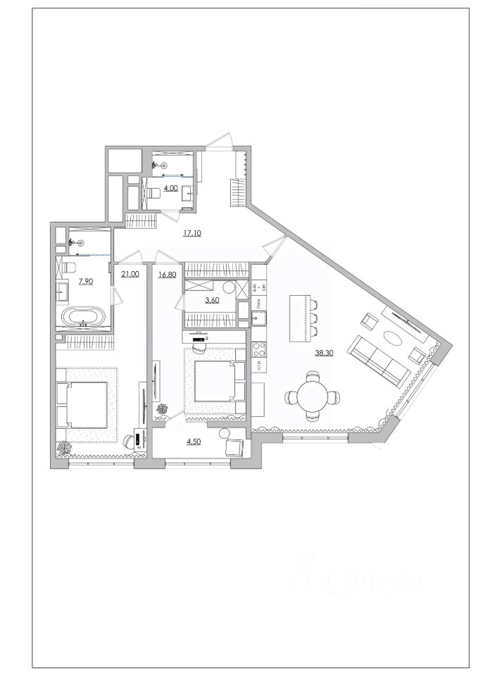 Центральное место в квартире занимает великолепная кухня-гостиная площадью 38,3 м2.