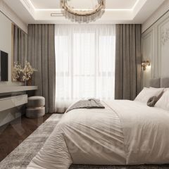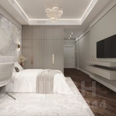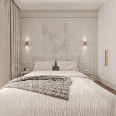 Мастер-спальня выполнена с учетом всех современных требований комфорта. Здесь достаточно пространства для размещения большой кровати и прикроватных тумбочек.