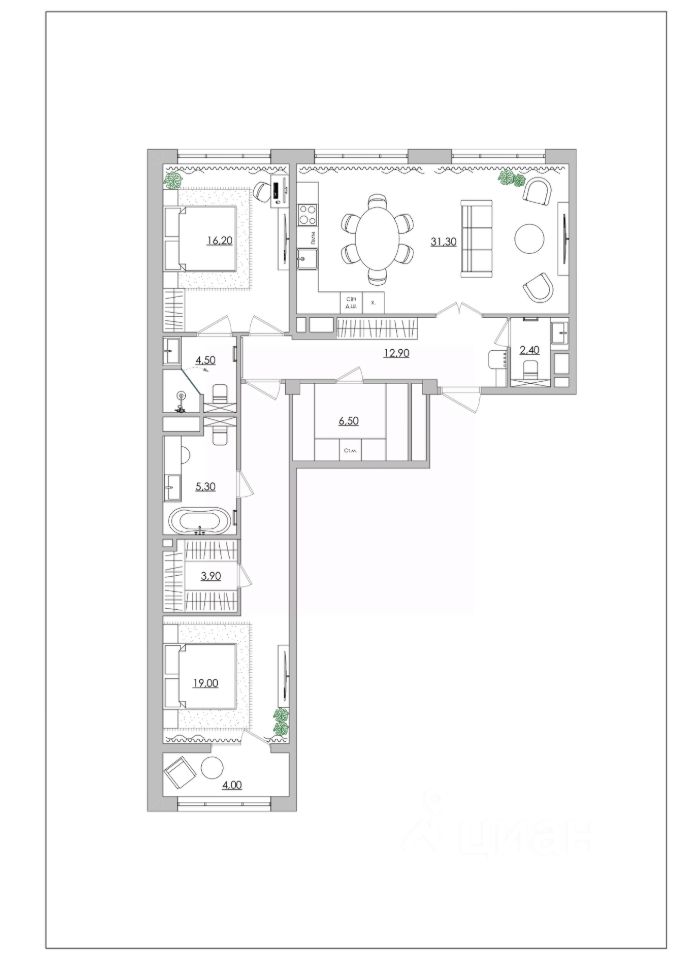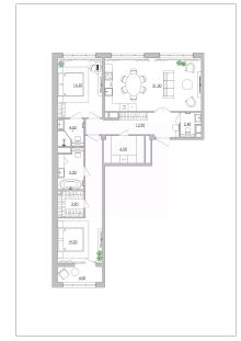 • Кухонно-обеденная зона: Здесь свободно размещается современный гарнитур (возможно, с "островом") и полноценный обеденный стол на 68 персон у одного из окон.