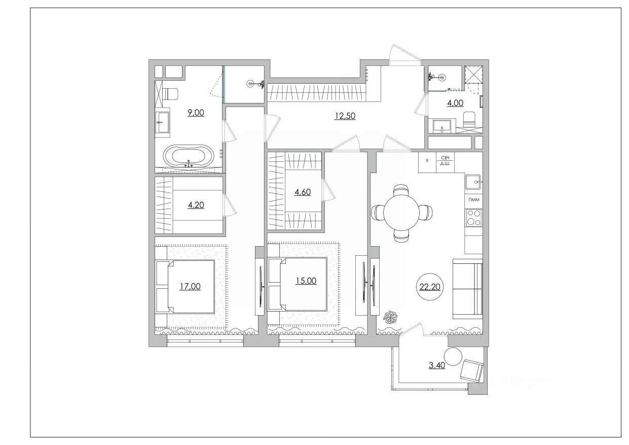Просторная двухкомнатная квартира площадью 91,9 м2 — это ода комфорту и продуманности. В её планировке каждый элемент направлен на создание максимального уюта, приватности и функциональности, превращая обычную "двушку" в по-настоящему роскошное и просторное жилье.