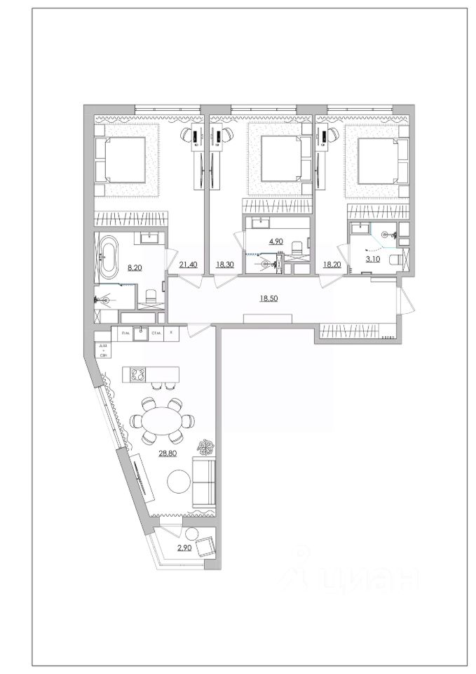 Концепция "Triple Master Suite": три спальни — три ванных комнаты.