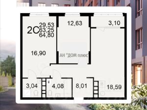 Двухкомнатная квартира 64.8 м² в ЖК "Радости жизни" от застройщика "Единство"