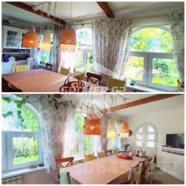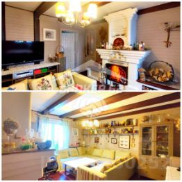 1 этаж - кухня с печью, газовой варочной панелью , духовым шкафом и современной бытовой техникой, столовая, гостиная с камином, две спальни, с/у, холл.