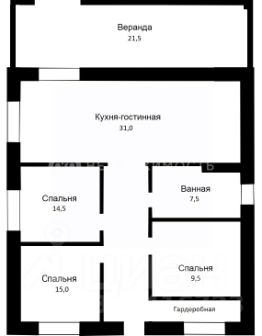 Планировка: 3 комнаты по 15, 15, 10 кв.м, кухня-гостиная 31 кв.м, санузел 7,5 кв.м, веранда 21 кв.м.