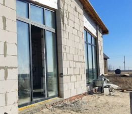 Дом одноэтажный, фундамент ленточный, цоколь из красного кирпича, стены из газобетонных блоков. наружние размером 25х40х60, внутренние 25х30х60, часть перегородок 25х10х60., по всей площади полов произведена бетонная стяжка, по периметру стен армированный пояс. Со стороны кухни - гостинной веранда площадью 27 кв.м.