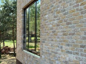 окна из профиля ALUTECH, окно витражное 5*1,5 м единое (есть фото с человеком для оценки размеров), все окна 2,2 м высотой и шириной 2/2,7 м, откосы выполнены по технологии BAUT
