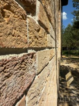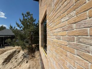 стены наружные - керамический блок 44 см и облицовка кирпичом ручной формовки двух видов 6 см