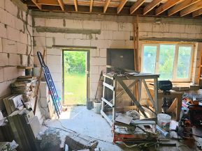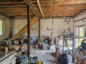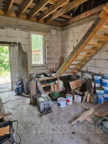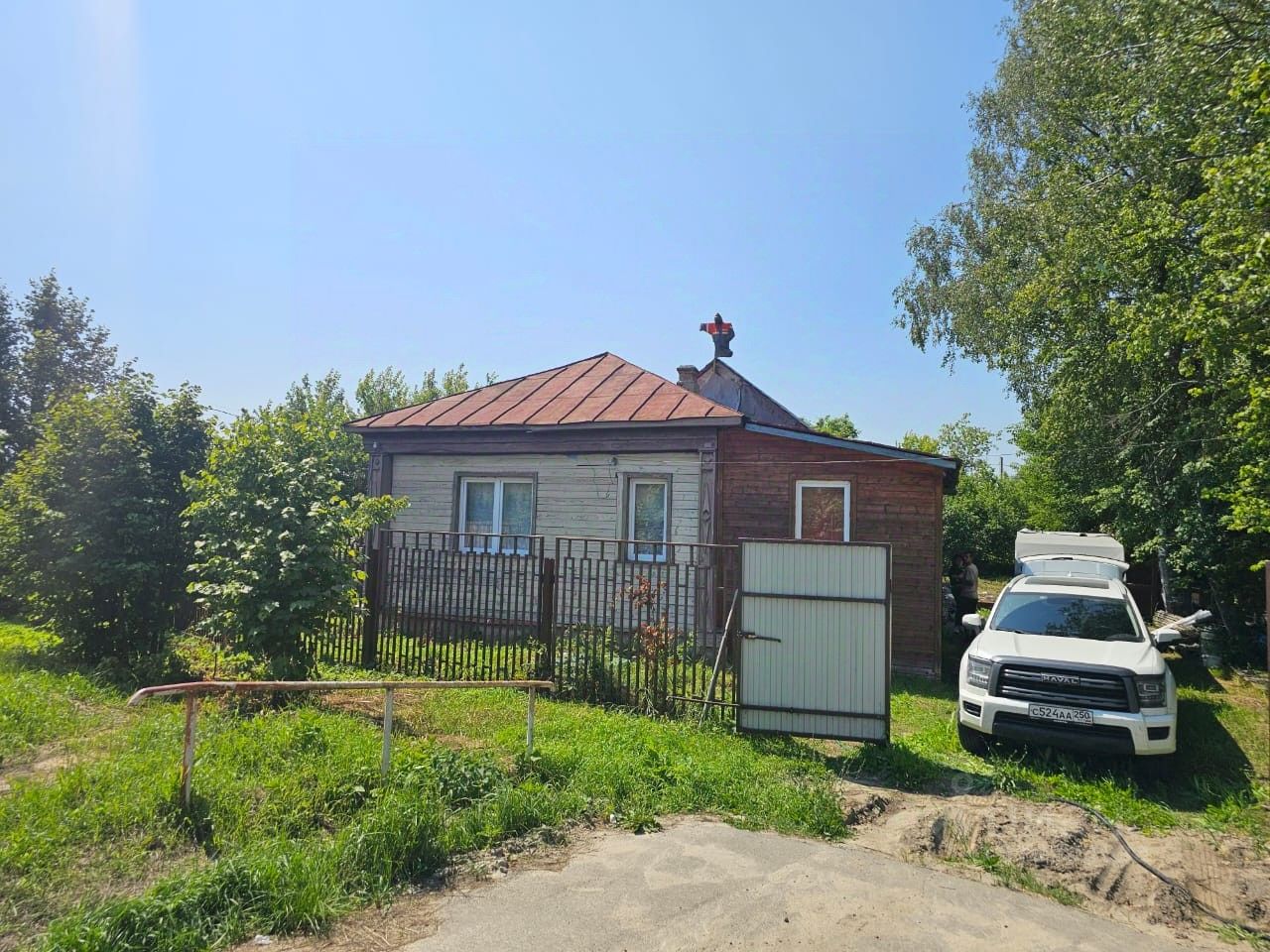 По периметру огорожен забором. Общая площадь дома 55 кв м (по факту больше). Одноэтажный, имеется пристройка и гараж с мансардой 8*12. Стены - бревно и блоки. Крыша - металл и металлочерепица. Установлены пластиковые окна. Во всем доме заменена электропроводка. В доме 4 комнаты, есть кухня и гостиная, совмещенный санузел с тёплым полом (установлены унитаз, раковина и душевая кабина).