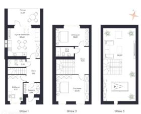 Таунхаус имеет общую площадь 152,49 кв. м. Кухня-гостинная, спальни, кабинет, веранда. Высота потолков — 2,94 м, что создаёт ощущение простора и свободы.
