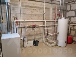 Все коммуникации: индивидуальный газовый котел с бойлером на горячую воду, электричество - 380 В (15 кВт.), вода - колодец, канализация - два переливных колодца.