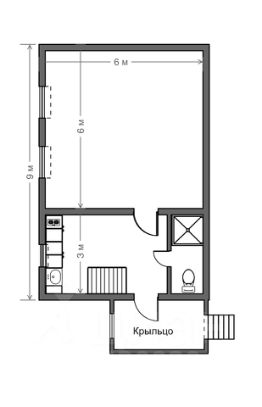На первом этаже расположена кухня, санузел и просторная комната. На втором этаже — одно больше пространство, которое отлично подойдёт для перепланировки по вашему вкусу. Площадь второго этажа позволяет сделать 2-3 отдельные комнаты.